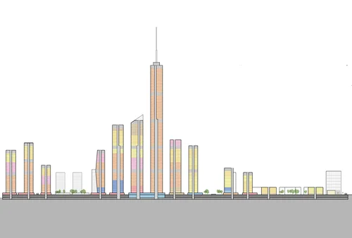 The New Metropolis development is ecologically responsible, transit-oriented, economically viable, culturally vibrant, and visually cohesive. Strategies for achieving an ecologically responsible and transit-oriented site include using local energy sources, encouraging innovation, planning for future growth, and providing various access points to the site based on user types. In order to be economically viable, culturally vibrant, and visually cohesive, The New Metropolis will contain an entertainment district, strong economic core, landmark buildings, arts initiatives, a lakefront character, and a plan that revitalizes the Bronzeville neighborhood. Our development includes three main east-west axes and a major boulevard running north-south through the site. This development connects with and draws in the surrounding neighborhood through public park spaces and retail storefronts along the transit hub and other major building podiums. The transit hub serves as a new major node for Chicago, providing connections to Lake Michigan, the Metra, CTA, bike paths, and our in-site Tram System. With a multitude of transit options, The New Metropolis is a completely car-free zone, with parking situated below the platform, separate from pedestrian thoroughfares. All street types in The New Metropolis are designed for pedestrian and bike traffic, with deep sidewalks and an array of green boulevards. Small city blocks increase the number of corner retail spaces and pedestrian routes, encouraging diverse social interaction. A Great Lakes Ecological Center is positioned east into Lake Michigan. The center is designated to house public conventions and educational facilities that reflect both local and global ecological research and innovation. Public and private green spaces throughout the site supply unique opportunities for outdoor meeting areas and allow for natural night to enter in within the dense, urban fabric.