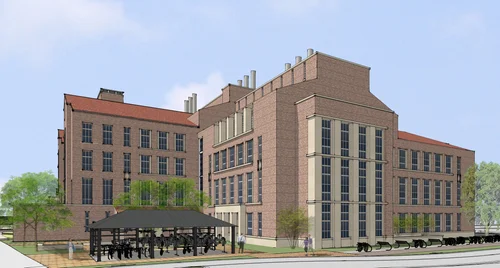 The following images convey the design for a proposed addition to the existing Jennie Smoly Caruthers Biotechnology academic building on CU Boulder’s east campus. The original premise of the design of the existing Biotechnology building was developed by Robert A.M. Stern Architects’ office. The E-Wing addition proposes three levels including offices, laboratory spaces, and state-of-the-art active learning classrooms. The design utilizes a cost-effective, efficient plan layout along with an overall scale and exterior aesthetic that is consistent with the original building.