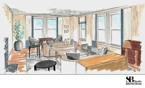 A custom hand rendering studying proposed interior furniture and finishings for an existing living room space.